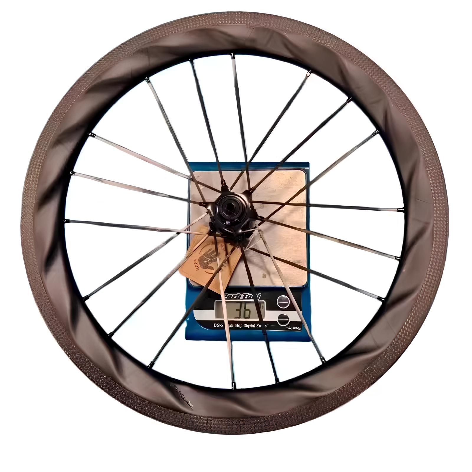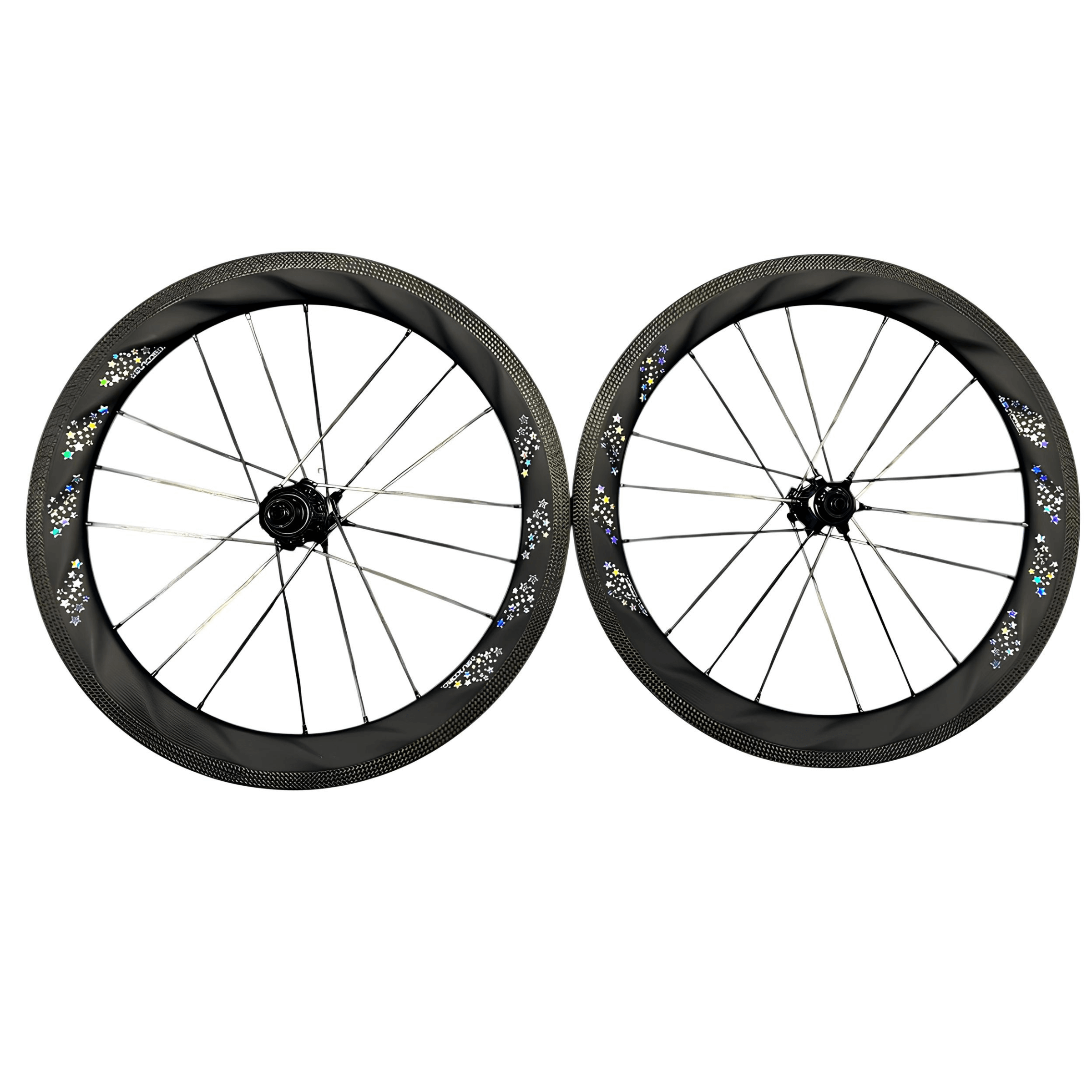 Spoke Material & Count : 18-hole front and rear configuration using carbon fiber spokes in a 2:1 lacing pattern (12+6) for optimized stiffness-to-weight balance.